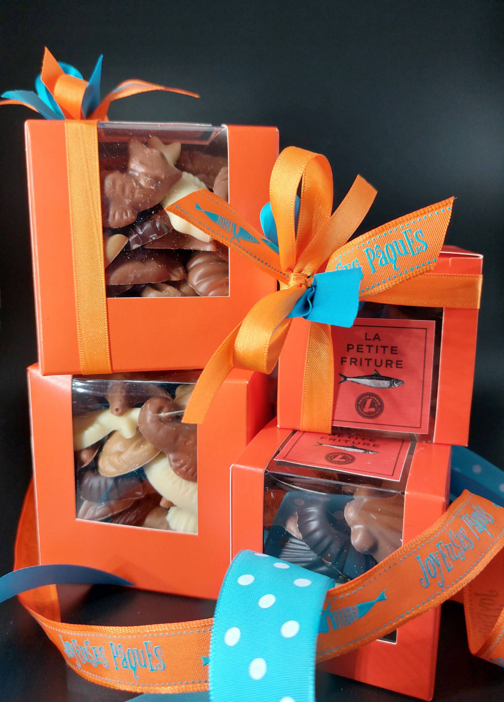 Retrouvez cette petite friture en chocolat dans une élégante boite cube à offrir pour le plus grand plaisir de votre famille et amis.