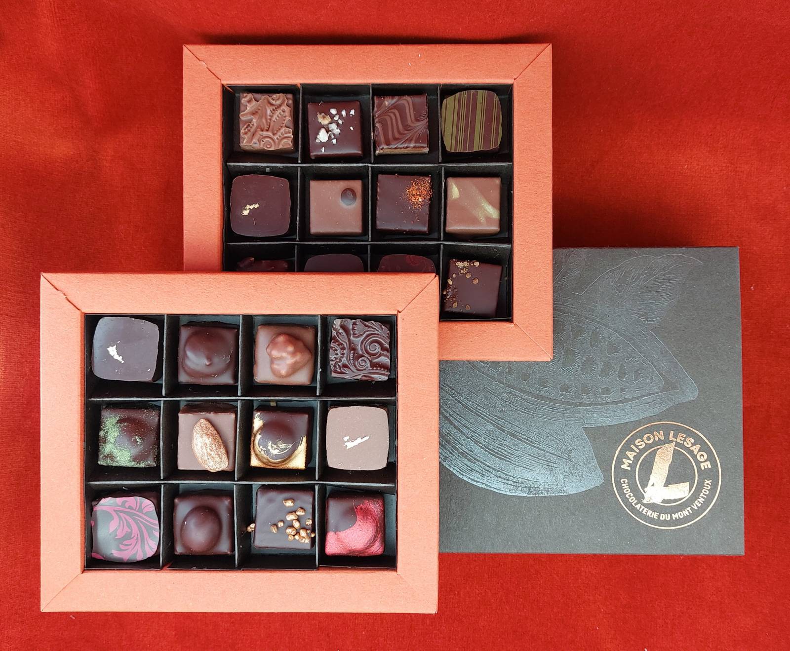 Vous n’avez pas encore trouvé une idée de cadeau pour vos clients, vos amis ou vos proches ? Laissez-vous tenter par le coffret de chocolat emblématique de la Maison Lesage offrant une sélection de 24 ganaches et pralinés, en assortiment noir et lait. Laissez-vous surprendre par les subtilités du goût Maison Lesage. Nous prenons un soin particulier à la sélection des matières premières haut de gamme, nécessaires à la fabrication de ces bonbons chocolat de haute qualité.