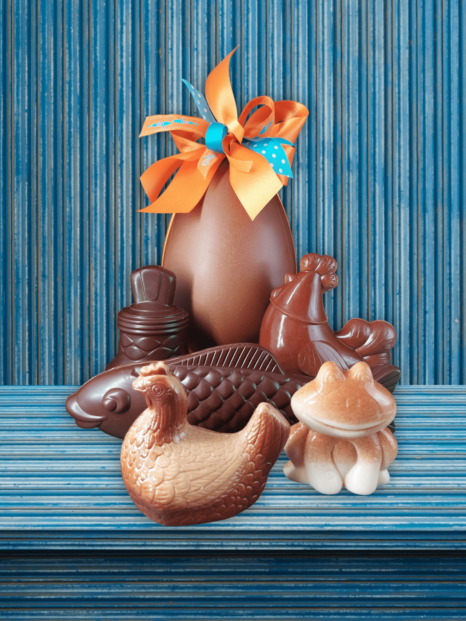La Maison Lesage-Chocolaterie du Mont Ventoux confectionne et propose un large choix de moulages en chocolat, dans la plus pure tradition de Pâques, parmi lesquels vous trouverez des poules, des poissons, des agneaux... et les incontournables oeufs de Pâques.