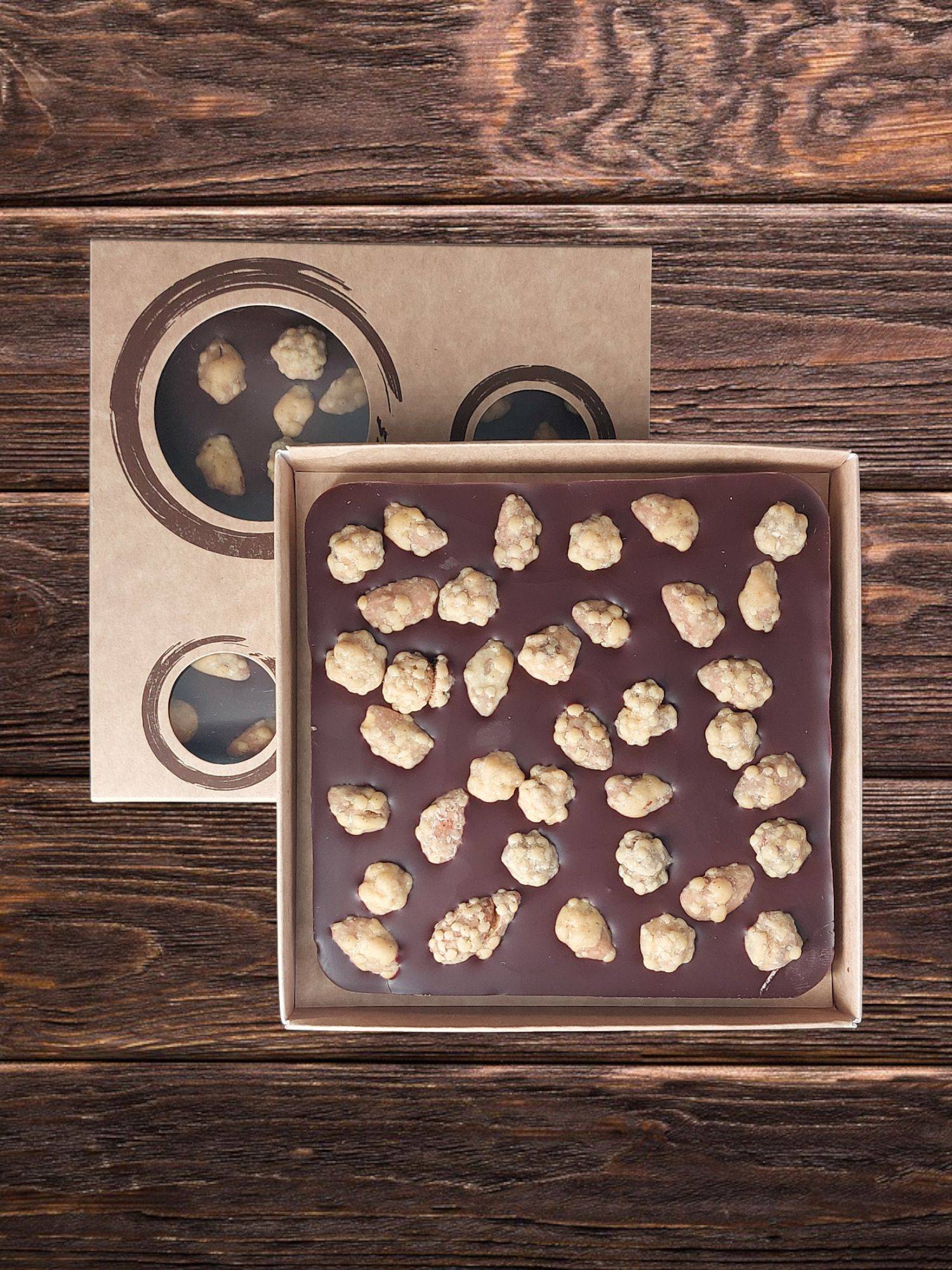 Votre chocolatier en Provence propose pour les plus gourmands, cette tablette de chocolat à casser en forme de carré qui mêle la richesse aromatique et le croustillant des noisettes du Piémont et des amandes de Provence lentement torréfiées à un chocolat noir, issu d'un savant mélange de fèves de cacao des Caraïbes et de Madagascar, et au profil aromatique riche et subtil laissant éclater des arômes de pruneaux confits et de raisons secs.